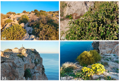 (a) Comunidad de Chamaeropo-Rhamnetum lycioidis, con predominio de Lycium intricatum y Atriplex halimus.(b) Suaeda vera es el taxón principal de la asociación Atriplici-Suaedetum verae en el Peñón de Salobreña. (c) Hábitatrupícola donde aparece la asociación de Rosmarinetum tomentosi. (d) Dos de los taxones más característicos del Peñón deSalobreña: Ephedra fragilis y Asteriscus maritimus