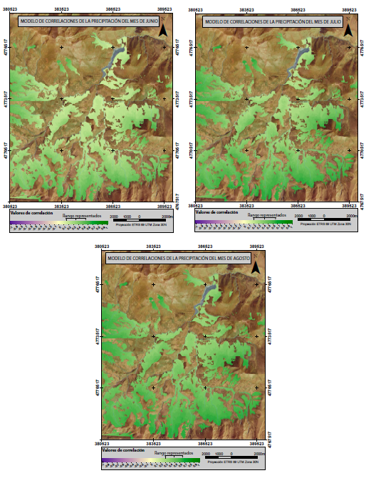 En el caso de las precipitaciones primaverales producidas en abril, mayo y junio, el modelo muestra coeficientes moderado de 0,61; 0,42 y 0,63 respectivamente (Fowler & Cohen, 1999). La distribución cartográfica de los valores de correlación (Figura 5) presenta unas correlaciones menores en los sectores más bajos del valle (0,2) que, progresivamente, ganan significación a medida que ascendemos en altitud y alcanzamos el límite superior del bosque en torno a 0,5-0,6. La respuesta positiva en todo el rango altitudinal demuestra la importancia que tiene la precipitación primaveral para la activación de funciones metabólicas del árbol. En los modelos generados para las precipitaciones estivales los valores son también moderados (julio: 0,67 y agosto: 0,51). La distribución espacial de correlaciones modelizadas sigue un patrón similar en los dos modelos con valores positivos en todo el ámbito, mayores en las zonas de mayor altitud, reduciéndose esta respuesta a medida que descendemos de cota y nos adentramos hacia el fondo del valle hasta valores en torno a 0,2.