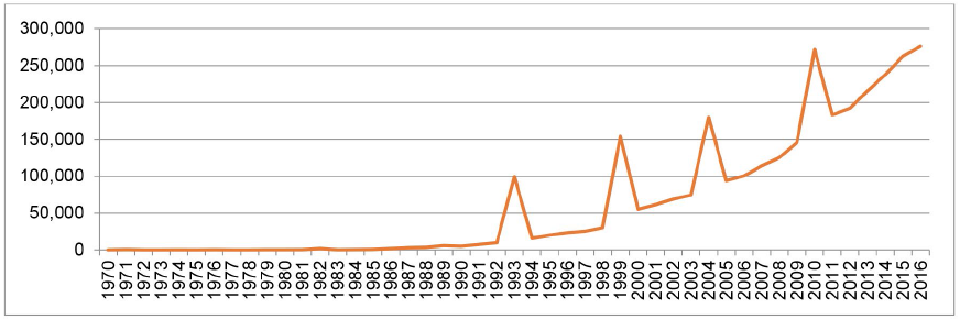 Con respecto al número de peregrinos su cifra no ha dejado de incrementarse desde el año 1970 cuando las fuentes oficiales contabilizan a 68 peregrinos, hasta 2016 año en el que se ha producido un nuevo record, 277.854 peregrinos, superando a los 272.703 registrados en el último año santo de 2010 (Oficina del Peregrino, 1970-2016). A este respecto, se debe señalar que los valores utilizados provienen de la Oficina del Peregrino gestionada por el cabildo compostelano, esto es, se trata de una fuente privada obtenida en un lugar donde los caminantes van a retirar un certificado de haber realizado la ruta (la denominada Compostela) (Xunta de Galicia y Universidade de Santiago, 2007-2010). En este registro existe una pequeña infravaloración del flujo (existen peregrinos no interesados en recoger el certificado) y un cierto sesgo religioso en las motivaciones consignadas. No obstante, con esta fuente se constata cómo en los años santos (cuando la festividad de Santiago coincide en domingo y se realizan grandes campañas de promoción de la ruta) existe un aumento considerable de caminantes. También se aprecia la dinámica seguida por la peregrinación a Santiago hacia convertirse en un producto global, pues desde 2012 los peregrinos españoles suponen menos del 50% del total. Los países de procedencia, después de España (44’7%), que más peregrinos contabilizan en 2016 son Italia, Alemania (ambas por encima de los 20.000 peregrinos), Estados Unidos (por encima de 15.000), Portugal, Francia (aproximadamente 10.000), Irlanda, Reino Unido (más de 6.000), Corea, Australia, Brasil y Canadá (por encima de 4.000) (Oficina del Peregrino).