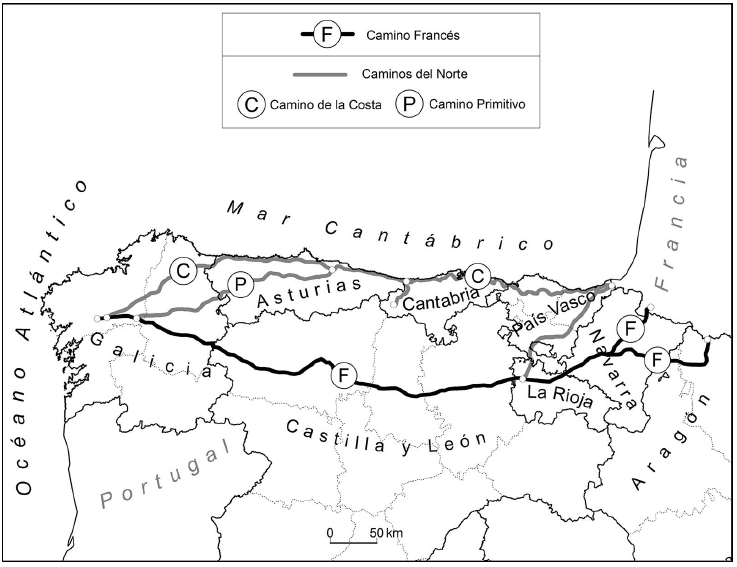 El Camino de Santiago es un itinerario de peregrinación cristiana que en las tres últimas décadas ha experimentado una importante revitalización. Una antigua ruta medieval es utilizada por hombres y mujeres contemporáneos, que quieren dirigirse caminando hacia esta ciudad histórica gallega, patrimonio de la humanidad, con motivaciones tan diversas como las que mueven a la compleja sociedad contemporánea a la que pertenecemos (Roseman, 2004; Lois González, 2013; Greenia, 2014). Para algunos el Camino sigue siendo esencialmente una ruta religiosa, pero para la mayoría las motivaciones espirituales, paisajísticas, patrimoniales o de simple gusto por retornar a la movilidad lenta constituyen el impulso fundamental para dirigirse a Santiago (Maddrell, 2013; Santos Solla y Pena, 2014). Como se ha subrayado en varios trabajos recientes, el desplazamiento a pie durante varias jornadas, enlaza con varios atributos de la cultura actual: la noción de que un ejercicio continuado es una práctica saludable, que permite relacionarse con otros (la idea de comunitas), contemplar el paisaje en toda su dimensión, a partir de un desplazamiento lento, y reencontrarse con uno mismo (Frey, 1998; Coleman y Eade, 2004; Lois González, Castro Fernández y Lopez, 2015)