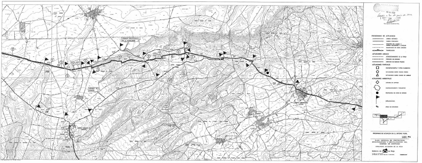 En el Plan Especial se incluían también fichas específicas del catálogo de bienes singulares para 11 municipios y un plan de actuaciones (Figura 5) diseñadas con el criterio de garantizar una cómoda circulación de los viandantes, buscando la continuidad del itinerario peatonal, mejorando la ubicación y las características de las áreas de descanso, ampliando los recorridos monumentales de interés en los núcleos urbanos, reordenando las plazas públicas y buscando la integración de determinadas áreas de especial valor ambiental (Gobierno de La Rioja, 1998).