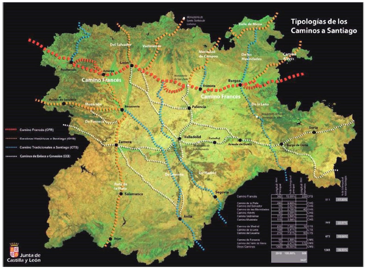 Los Caminos declarados Patrimonio Mundial (Figura 2) recorren más de 2.500 kilómetros a través de ocho comunidades autónomas y más de 300 municipios. A pesar de existir desde 1987 un Consejo de coordinación entre la Administración General del Estado y las administraciones autonómicas y un comité técnico para armonizar los criterios de planificación, lo cierto es que la ordenación en cada región presenta importantes diferencias, tanto en los instrumentos empleados, como en la escala utilizada o en la estrategia que define el tipo de intervención sobre el Camino.