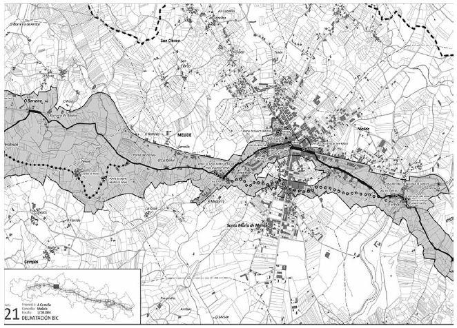 En Galicia, las normas subsidiarias de planeamiento provincial aprobadas en 1991 establecían un ámbito de protección de 100 metros a cada lado del Camino. Tiempo después, en 1996, la Ley de Protección de los Caminos fijaba al igual que en otras regiones las franjas de protección del Camino (3 metros) y del contorno (30 metros), además de un régimen sancionador y una normativa genérica mientras no se implementaba un Plan Especial regional que, según la disposición adicional de esta Ley, debía aprobarse en el plazo de dos años (Xunta de Galicia, 1996). En 2011 eran las Directrices de Ordenación del Territorio las que fijaban la necesidad de aprobar un Plan Especial para el Camino (Xunta de Galicia, 2011), y finalmente, la nueva Ley de Patrimonio Cultural de Galicia de 2016, establecía un nuevo plazo de dos años para aprobar un Plan Territorial Integrado de los Caminos de Santiago (Xunta de Galicia, 2016). En resumen, el tiempo ha ido pasando desde 1996 y a pesar de la obligatoriedad de desarrollar este Plan han transcurrido ya 20 años sin que se haya aprobado. Curiosamente, el mismo largo espacio temporal que media entre la delimitación provisional, en 1992, y la delimitación definitiva de los Caminos de Santiago en Galicia en 2012.