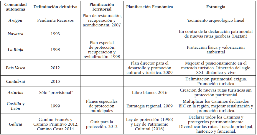 No obstante, se ha comprobado cómo cada autonomía presenta unas estrategias diferentes para abordar tanto la protección y conservación del bien patrimonial como su promoción y difusión turística, desde la supuesta falta de interés que se presume por la total ausencia de documentos en Navarra a los conflictos que generan la profusión y solapamientos de planes y programas en Castilla y León. De la protección amplia y bien documentada de La Rioja a la exigua de Cantabria o provisional de Asturias. De la singularidad del Camino Francés en Navarra a la multiplicación de rutas jacobeas en Castilla y León o Galicia. De los estudios arqueológicos en Aragón al posicionamiento de las rutas vascas en el mercado jacobeo. La amenaza real del planeamiento regional es fracturar el Camino en segmentos que compitan entre sí, convirtiendo un producto único en ocho productos regionales que busquen su singularidad.