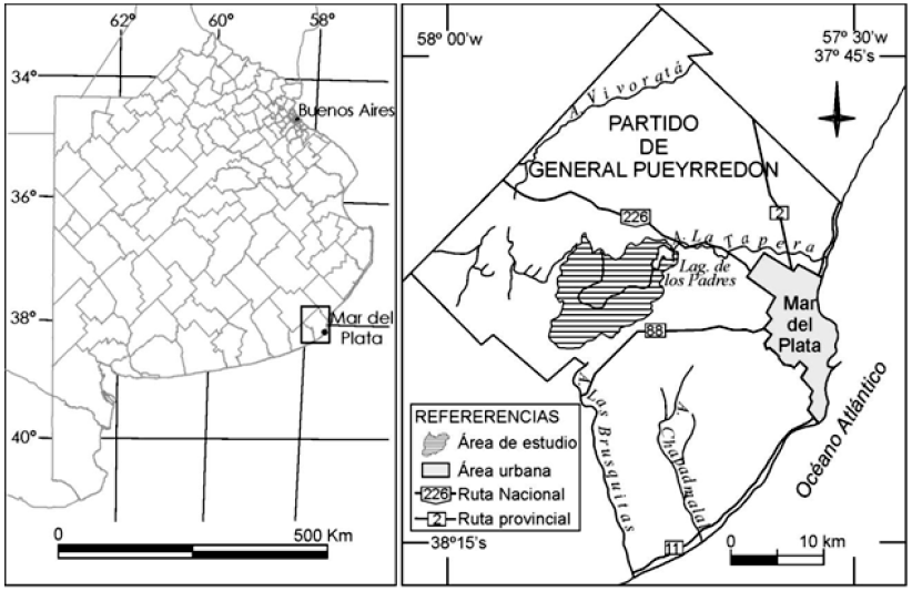 Se considera la Laguna de los Padres cita en el Sistema de Tandilia (Fig. 1). Esta posee una red de drenaje bien definida con arroyos de escasa expresión topográfica6, que descienden de las sierras en dos vertientes, norte y sur. Se trata de un cuerpo de agua de régimen permanente y somero con una superficie de 2.97 km2 y una profundidad media de 1.24 m (Pozzobon & Tell, 1995). Recibe un único afluente, el Arroyo de Los Padres y drena parte de sus aguas superficiales a través del Arroyo de La Tapera.