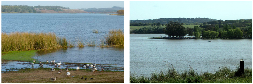 Los montes cultivados para el uso recreativo, constituidos por vegetación leñosa, ocupan el área que bordea la laguna: pinos, cipreses, acacias, sauces y álamos entre otros. Asociados a los cuerpos de agua se desarrollan juncales, pajonales de totora. Entre la vegetación acuática se encuentra la gambarrusa (Alternanthera philoxeroides) y la cola de zorro (Cortaderia selloana). La fauna es diversa y abundante. Existen más de ciento veinte especies de aves relacionadas con el ambiente acuático (Frangi, 1975; Cabrera 1976; Bellagamba, 1997; Romanelli y Massone, 2011).