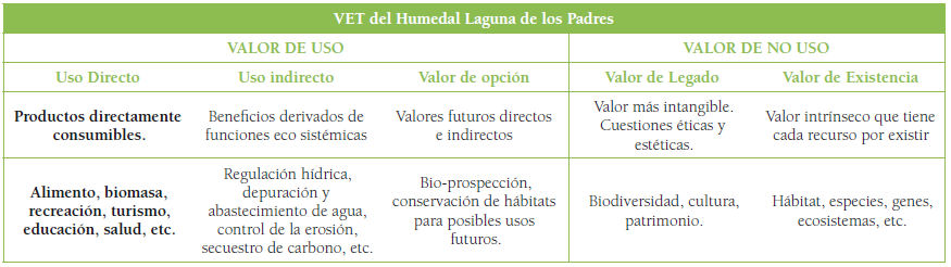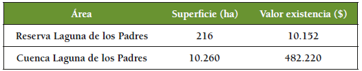 Para determinar el valor de existencia de la laguna se extrapoló ese valor a dos escenarios: 1. La superficie de la Reserva Laguna de los Padres y 2. La superficie de la cuenca Laguna de los Padres como puede verse en la tabla 7. Mientras que la tabla 8 resume el VET asociado al humedal Laguna de los Padres.