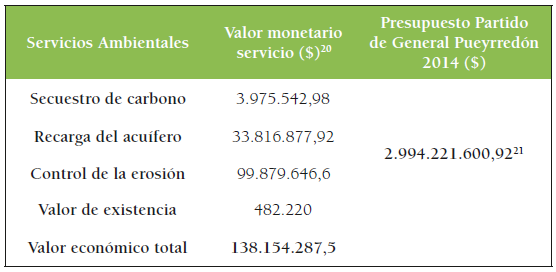 El conocimiento de la situación ambiental de los beneficios ecosistémicos del humedal Laguna de los Padres permitió expresar en términos económicos una medida aproximada -posiblemente infravaloradadel VET de los SE que asciende a más de 138 millones de pesos/año, equivalentes al 4,6% del presupuesto total anual del Municipio para el año 2014. Es interesante comparar este valor con otras inversiones sociales del presupuesto municipal de casi 300 millones de pesos. Por ejemplo, en educación la inversión anual alcanza el 28%, o en salud un 21.23 %. Y para obras públicas se destinan 400 millones de pesos -un 13 %- mientras que a la nueva Secretaría de Seguridad y Control recibió más de 183 Millones -un 6 %-.