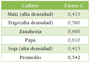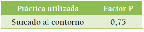 P es el factor utilizado para diferentes prácticas y obras de conservación del suelo y agua y al igual que para el factor C hay valores medios ya calculados. En la zona bajo estudio hay curvas de nivel en las laderas y escurrimiento por surcos del riego por aspersión. Acorde a la tabla propuesta por el Instituto para la Conservación de la Naturaleza [ICONA] (1988) y Rodríguez, Florentino, Gallardo y García (2004):