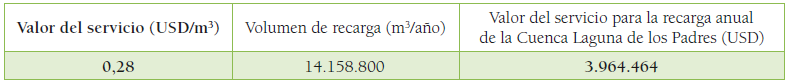 A partir del valor del m3 de cuenta y la recarga anual de la cuenca, se obtuvo el valor monetario del servicio ambiental de la recarga media anual para la Cuenca Laguna de los Padres cercana a los 4 millones de pesos (tabla 2).