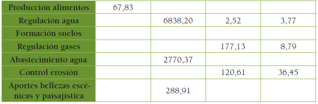 Para el cálculo monetario se utilizó el valor obtenido por Agudelo Patino y Correa Restrepo (2000)11 para el servicio control de la erosión en bosques y praderas. Los valores generados para los servicios ambientales de distintos ecosistemas se exponen en la tabla 4.