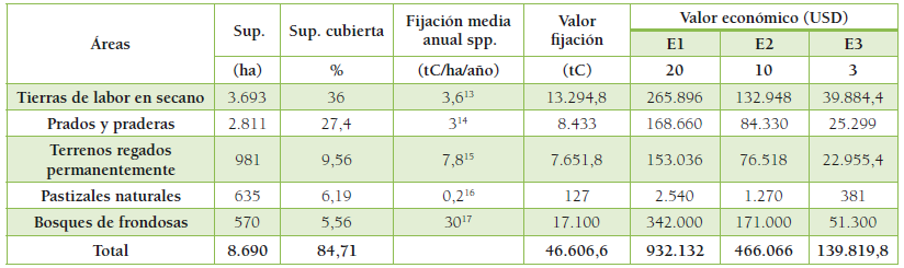 Una vez calculada la capacidad biofísica de secuestro se determinó el valor económico del SE considerando tres escenarios posibles de precios12frente a la ausencia de un precio único: E1: US$20/t CO2, E2: US$10/t CO2y E3: US$ 3/t CO2 (Guerrero et al. 2013).