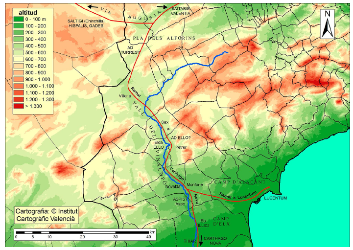 Por lo que respecta a la orografía, la cuenca del Vinalopó ocupa en su mayor parte un valle que ha funcionado como corredor mediterráneo desde la Antigüedad, a pesar de encontrarse a cierta distancia del mar. Ello se debe al hecho de que entre Dénia y Alacant algunas de las sierras subbéticas llegan hasta la misma orilla de Mediterráneo, lo que siempre ha dificultado el trazado de una ruta litoral y ha priorizado el paso en cambio por el valle de Montesa, el llano dels Alforins y el valle del Vinalopó. Este último, además, permite conectar dicho corredor mediterráneo con la Meseta castellana y con la Andalucía occidental.