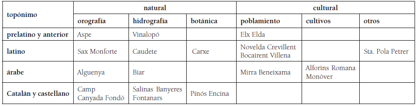 Para describir y analizar el contenido semántico de los topónimos de núcleos de población del Vinalopó hemos agrupado los topónimos en función de si describen un rasgo físico (natural) del paisaje o bien uno humano (cultural) del mismo.