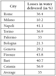 De Gironimo, G. (2013). Consumi di Acqua per Uso Domestico e Perdite di Rete. IX Rapporto sulla Qualitá dell Ambiente Urbano, Roma 11 October. Retrieved from http://www.areeurbane.isprambiente.it/it/pubblicazioni/rapporti/ix-rapporto/slide-dei-capitoli/cap-5