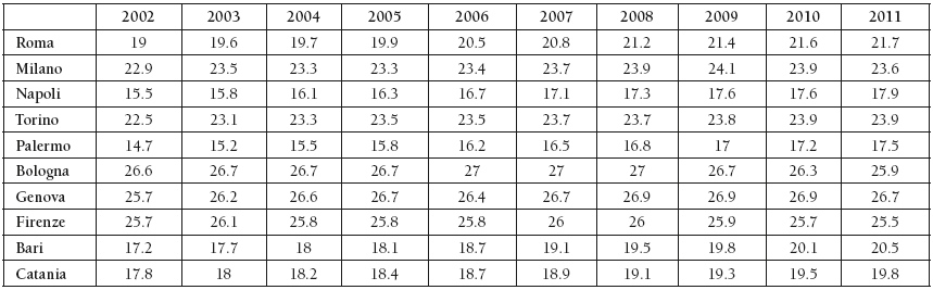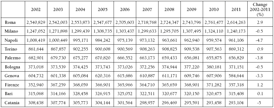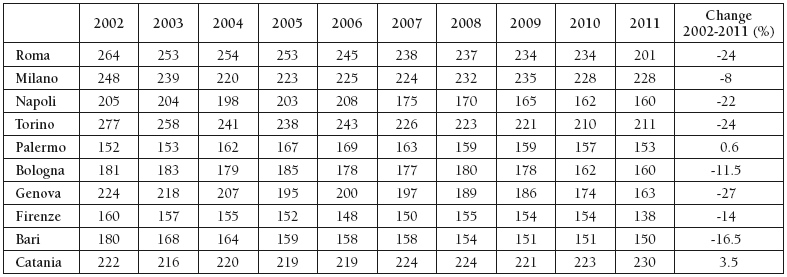 Next we will describe trends in factors that may contribute to the explanation of this decline, beginning with population changes which will serve us as a contextual element. Table 3 shows population changes in the 10 largest Italian cities between 2002 and 2011. From the table it can be deduced that the population of most cities stagnated or declined during that period, in some cases (Naples, Palermo, Genova and Catania) rather noticeably. In fact, only the capital, Roma recorded slightly larger numbers in 2011 compared to 2012 whilst very small increases can be observed for Torino, Firenze or Bari.