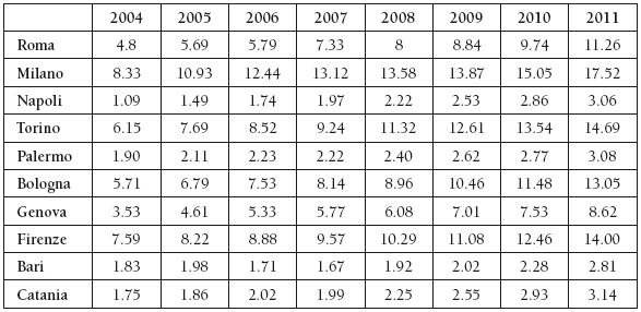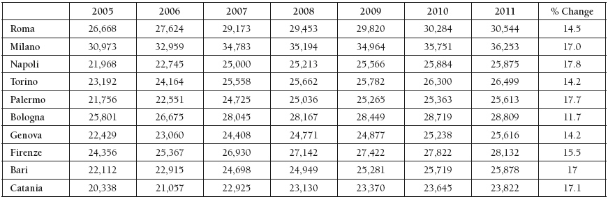 Concerning immigration, the recent population growth in Italian cities is to an important extent a consequence of the arrival of foreign nationals. Between 2001 and 2011, the foreign population living in Italy grew from 1,334,889 to 4,029,145 persons and the proportion of foreigners over nationals increased from 2.3 percent of the total to 6.7 percent. Given the low fertility rates and the aging of the population, immigration is the factor that currently fuels population growth in the country. During the same period Italian nationals decreased by more than 250,000 individuals (0.5%), while foreign individuals increased by 2,694,256 people (201.8 percent). In other words, after almost two decades of stagnation the population in Italy began to grow again thanks to the arrival of immigrants and their higher fertilities. In table 5 we can acknowledge the evolution of immigration for the ten largest Italian cities between 2004 and 2011. Again, the most important differences concern Northern and Southern cities. The highest number is found in Milano, where 17.5 percent of the registered population is foreign. Smaller but significant proportions are found in Torino, Firenze, Bologna and Roma while the proportion of immigrants in the Southern cities is comparatively very small (below 5 percent in all cases) but growing quite fast. Also of note is the speed at which the foreign population is expanding with percentages in 2011 twice or greater than the percentages of 2004.