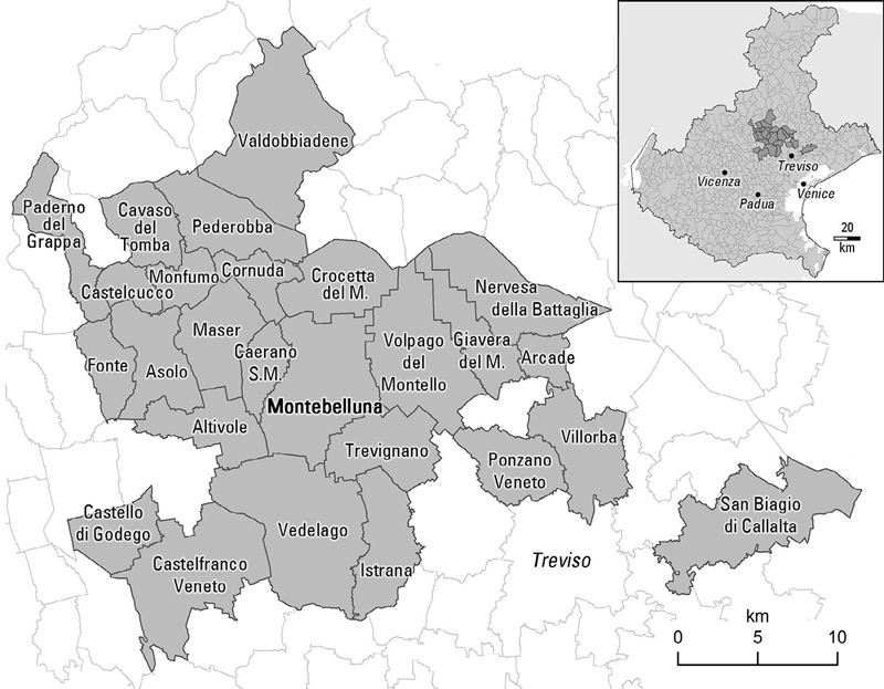 This article focuses on one of the places that symbolically represents the early establishment and subsequent crises of the industrial districts. This is the so-called Sportsystem (clothes and footwear) of Montebelluna (in Treviso) that is not only in its field the district leader at national level, but also plays a decisive role internationally. It is located close to the centre of the heart of the Northeast: the triangle of Treviso, Vicenza, and Padua (see fig. 1).