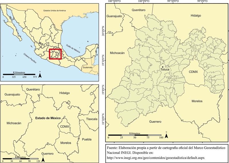 El Estado de México (EDOMEX) es uno de los treinta y dos estados que conforman la República Mexicana, se localiza en el centro del país y limita al norte con los estados de Querétaro e Hidalgo, al sur con los estados de Morelos y Guerrero; al oeste con el estado de Michoacán, al este con los estados de Tlaxcala y Puebla, y rodea a la Ciudad de México CDMX. Con una superficie total de 22 mil 499,95 Km2, se divide en 125 municipios y su ciudad capital es Toluca (ver figura 1). Cuenta con una población total de 16 millones 187 mil 608 habitantes siendo la entidad más poblada del país (Instituto Nacional de Estadística y Geografía [INEGI], 2015).