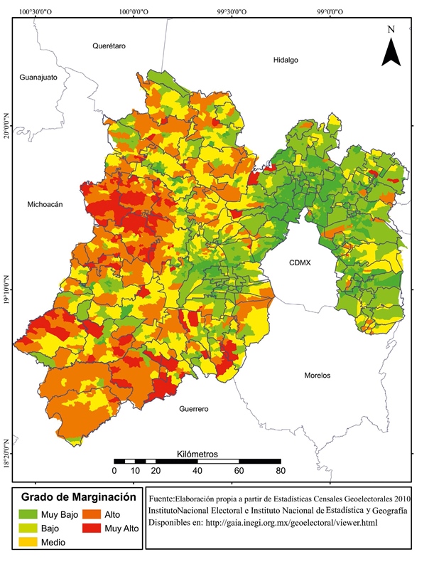 Según la estimación realizada para el IM por sección electoral 2010 para el Estado de México, se puede observar en la cartografía (ver figura 2), representado según los grados de marginación, que existe una concentración de GM Muy Alto y Alto en el sector oeste y suroeste del estado, con ciertas entidades aisladas en la porción centro y este de dicha entidad. Los GM de Medio, Bajo, y Muy bajo se concentran en el noreste y centro.