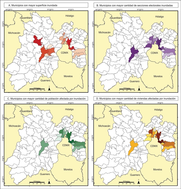Cabe precisar que, según las tablas mencionadas, el listado de municipios de cantidad de viviendas y población afectada es equivalente, pero con distinto orden de relevancia, motivo por el cual se representaron las dos variables. Sin embargo, difieren con el listado de municipios con mayor cantidad de secciones electorales inundadas en el municipio de Metepec y Cuautitlán Izcalli. En el caso de los municipios con mayor superficie inundada, el listado es disímil con respecto a los anteriores, ya que esta variable no es proporcional a las demás. Las cuatro variables se encuentran representadas en escalas colorimétricas según su orden en la lista, de esta forma, el color más intenso representa el municipio que se encuentra primero, y representando con el color más tenue el que se encuentra en última posición,