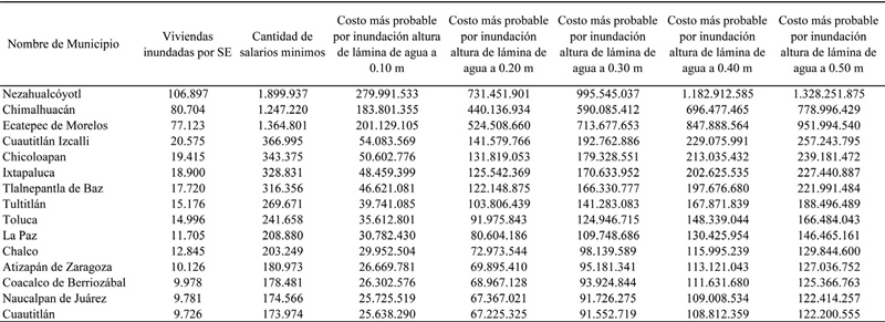 En la tabla 9, se pueden observar los quince municipios con mayores costos por daños potenciales tangibles directos más probables a una altura de la lámina de agua de 0.10 a 0.50 metros, según la totalidad de las viviendas afectadas de ese municipio en particular, los cuales coinciden con los municipios con mayor cantidad de viviendas afectadas (figura 3D). Al igual que los valores anteriores, los costos de daños corresponden a valores acumulados en trece años (2000-2012) para los municipios seleccionados.