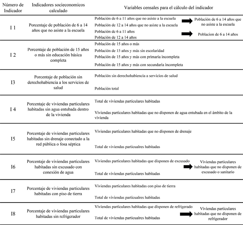 El cálculo de los ocho indicadores según las variables seleccionadas, utilizando los nemónicos del INEGI, fueron: