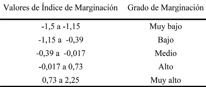El IM fue creado por el Consejo Nacional de Población (CONAPO) con la finalidad de disponer de un indicador comparable en todo el territorio nacional. Se basa en el cálculo de indicadores socioeconómicos, a partir de diferentes variables censales, que permiten medir formas de la exclusión social, indicando el nivel relativo de privación en el que se encuentra la población. Dicha medida es análoga al Índice de Rezago Social IRS del Consejo Nacional de Evaluación de la Política de Desarrollo Social (CONEVAL) y al Índice de Desarrollo Humano (IDH) elaborado por el Programa de las Naciones Unidas para el Desarrollo (PNUD) (CONEVAL, 2016; PNUD, 2016).