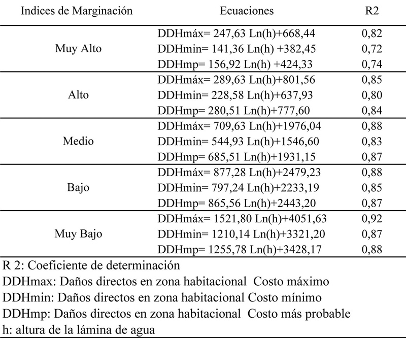 Finalmente, se calcularon los daños potenciales tangibles directos de las inundaciones en las zonas habitacionales del Estado de México a través de las ecuaciones propuestas en la metodología de Baró Suarez, et al. (2012) (ver tabla 3). Las ecuaciones de IM Medio, Bajo y Muy Bajo de viviendas de dos plantas no se aplicaron en este estudio, ya que esta información no es brindada por el Censo de Población y Vivienda INEGI, 2010.
