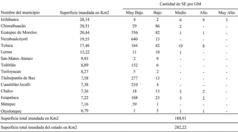 La superficie total inundada en el conjunto del estado, según los resultados obtenidos, fue de 283 Km2. En solo quince municipios hay 188.91 Km2, 67 % de la superficie total inundada, como se puede ver en la tabla 4 y se representa en la figura 3A.