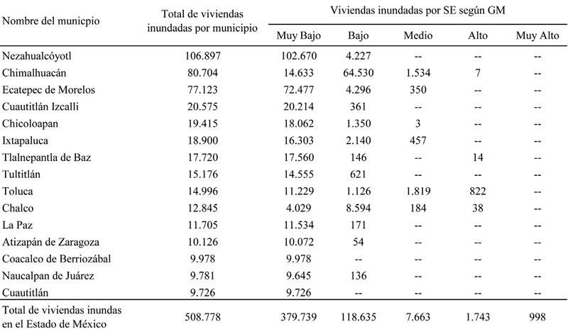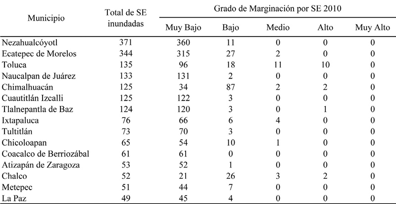 A partir de los resultados obtenidos, es posible concluir que, de los 125 municipios que conforman el Estado de México, 75 de ellos se inundaron en el periodo 2000-2012, es decir el 60% de la totalidad de la entidad. El municipio de Ixtlahuaca debería ser el que reflejara mayores pérdidas económicas en cuantos a los daños tangibles directos, debido a la superficie afectada por las inundaciones en el periodo 2000-2012, sin embargo, los municipios restantes, como Nezahualcóyotl, Chimalhuacán, Ecatepec y Toluca, son lo que reflejan una mayor cantidad de viviendas y población afectada en el conjunto del estado. Por este motivo, los costos de daños son mayores en dichos municipios, sin guardar relación con la mayor superficie afectada. Ya que, por sus características, la mayor parte de las viviendas afectadas se localizan en secciones electorales con un grado de marginación Bajo y Muy Bajo, en virtud que ese es el grado en los municipios que más se inundan.