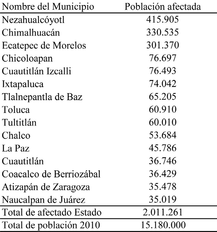 Unos pocos ejemplos de ello, son las inundaciones ocurridas en septiembre de 2012 en los municipios de Nezahualcóyotl (Méndez, 2012); agosto de 2014 en el municipio de Naucalpan (Jiménez Jacinto, 2014); y las más recientes inundaciones en agosto y primeros días de septiembre de 2017 en los municipios de Tlalnepantla y Cuautitlán Izcalli (Victoria, 2017) y Ecatepec de Morelos (Fernández, 2017), entre otros. En forma general, las afectaciones de dichas inundaciones fueron perdidas de bienes dentro de las viviendas, anegamiento de vías de comunicación principal, daños en hospitales y escuelas, etc., todo ello provocado por la rápida saturación de los drenajes profundos y superficiales.