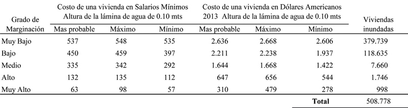 En la tabla subsecuente se muestran los costos de daños tangibles directos más probables, máximos y mínimos, cantidad de salarios mínimos y costo en dólares americanos de 2013 en una vivienda según el GM correspondiente y a una altura de la lámina de agua de 0.10 metros (ver tabla 8). Los costos de daños corresponden a valores acumulados en trece años (2000-2012).