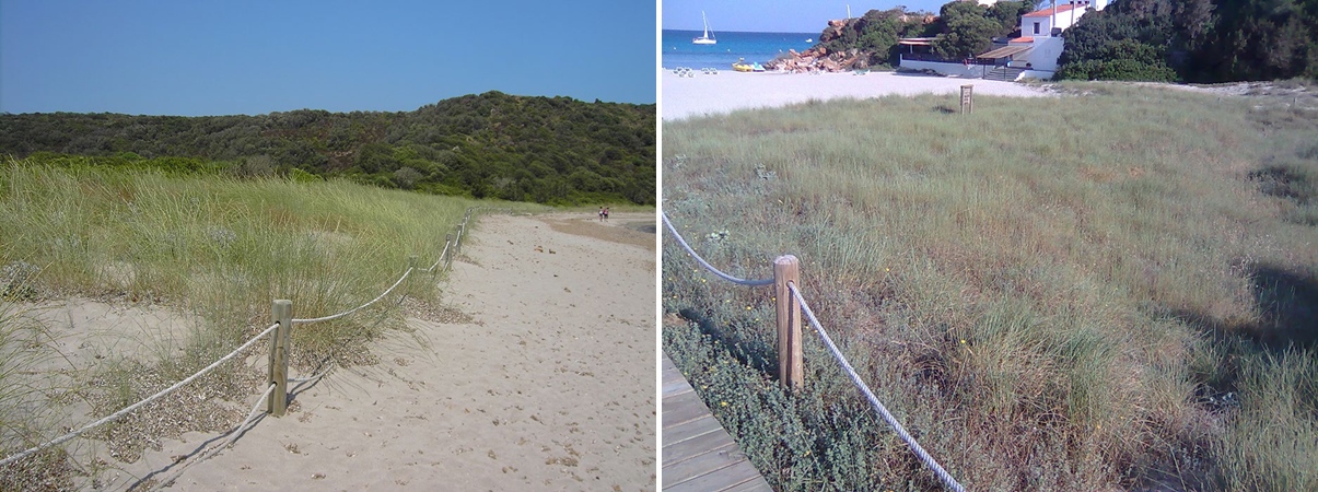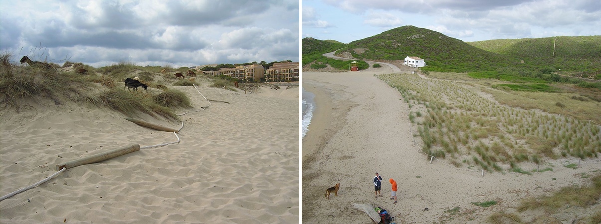 A: Presencia de cabras remoneando la Ammophila arenaria, favoreciendo la erosión del sistema delantero, donde se aprecia una falta de mantenimiento (Cala Mesquida, Mallorca). B: Revegetación de la playa de sa Mesquida (Menorca) con la creación de morfologías dunares en la parte posterior de la actuación.