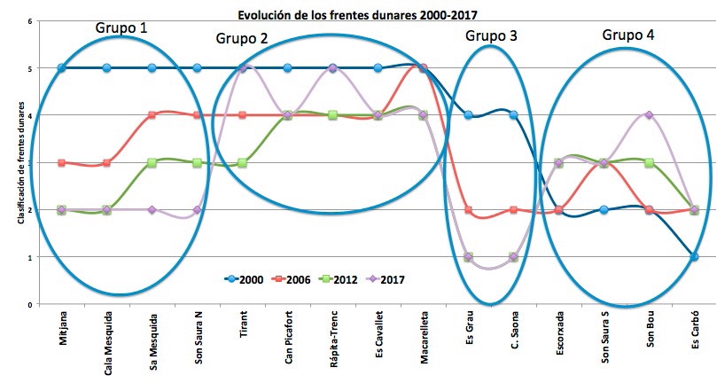 Grupo 4: Los sistemas dunares de Son Saura del S, Escorxada, cala’n Carbó y Son Bou presentaban un estadio medio de conservación de 1,75 en sus frentes dunares en el año 2000, mientras que en 2017 este valor medio es de 3, con una tendencia erosiva asociada a las medidas de gestión aplicadas en sus foredunes. La aplicación de técnicas en sistemas equilibrados da lugar a la desestabilización, alteración e incrementos de usos sobre ellos reactivando y alterando los procesos naturales.