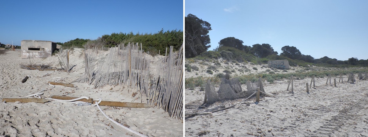 Fotografías de los autores.De las actuaciones realizadas sobre estos sistemas se puede concluir que no se han seguido las medidas y tipologías de trampeo prupuestas por Ley et al. (2007). Se ha observado que en las actuaciones realizadas en Baleares no ha habido un análisis detallado del estado primigenio ni la utilización de materiales, ubicación, orientaciónones o potencias adecuadas de trampas, no dando resultados inicialmente previstos, como se observa en las figuras 3 y 4. Cabe destacar que las tareas de gestión y reposición de materiales se han realizado en todos los casos entre los meses de abril y mayo, sin mantener las instalaciones en los períodos de máxina influencia eólica y baja frecuentación en invierno.