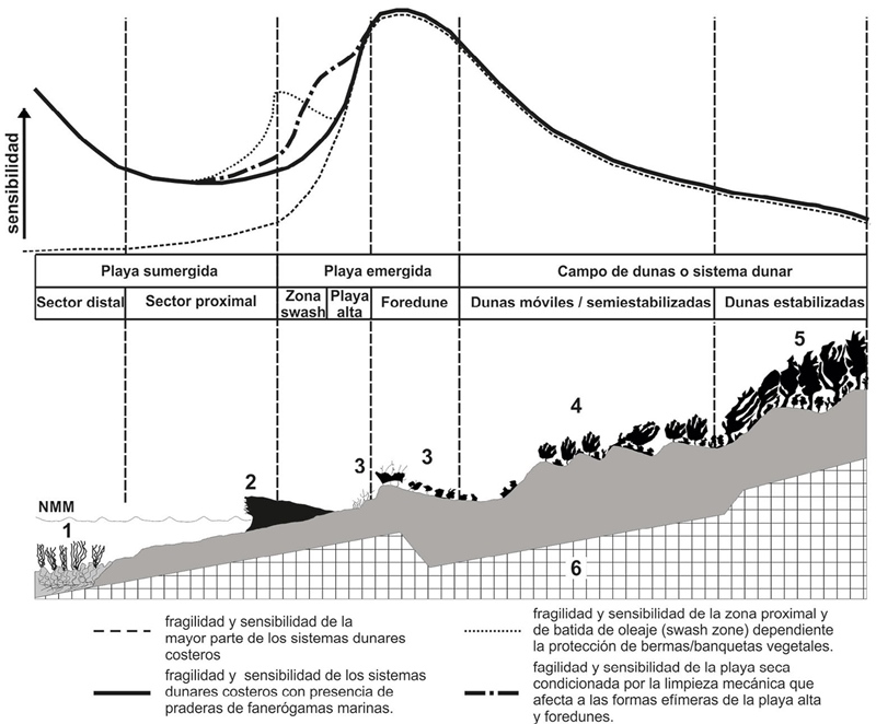 El grado de sensibilidad morfodinámica de los sistemas playa-duna presenta diferentes sectores de interrelación (figura 1) y sobre cada uno pueden darse una serie de medidas que afectan la estabilidad del sistema en conjunto. Estos puntos de sensibilidad han sido definidos a partir de las afectaciones asociadas a una incorrecta gestión sobre ellos. La primera curva de sensibilidad, y asociada a los sistemas playa-duna de Baleares, fue descrita por Rodríguez-Perea et al. (2000), y se sitúa sobre las praderas de Posidonia oceanica como hábitat productor de sedimento, estabilizador de la playa sumergida y disipador de la energía del oleaje. La segunda curva de sensibilidad, establecida por Roig-Munar y Martín-Prieto (2005), se sitúa sobre las bermas acumuladas de Posidonia oceanica sobre el swash, por su importancia como sector de transferencia sedimentaria entre los sectores emergido y sumergido, como aporte de sedimentos y aporte de materia orgánica entre la playa y las comunidades vegetales dunares, básicas para la estabilización, así como elemento amortiguador de la fuerza de los temporales. Las retirada mecánica de estas bermas dan lugar a la erosión continua del sistema playa. La tercera curva de sensibilizad se encuentra sobre la playa emergida, donde las actuaciones mecánicas de limpieza afectan a las morfologías efímeras de playa alta y a la desestabilización de taludes en los frentes dunares (Roig-Munar, 2004). La cuarta de las curvas se sitúa sobre los primeros cordones dunares, que define su debilitación, erosión y/o desaparición del conjunto playa-duna (Brown y McLachan, 1990; Rodríguez-Perea et al., 2000) y que se ve afectada por la urbanización, por la frecuentación de usuarios, por la presencia de servicios sobre el sistema y por la degradación de la vegetación dunar.