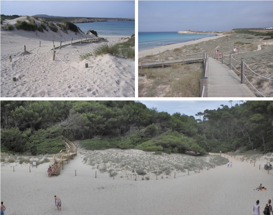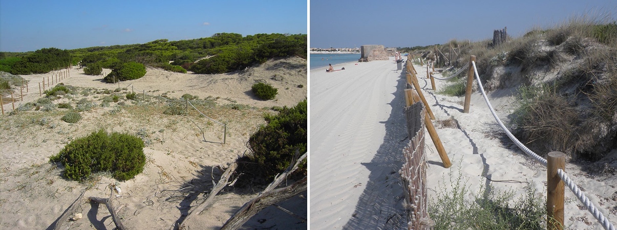 A: playa de es Trenc (Mallorca). B: playa de es Carbó (Mallorca), convietiéndose estas instalaciones en elementos que favorecen procesos erosivos en el frente dunar.