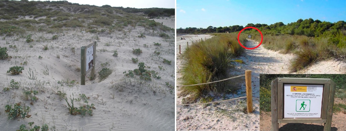 A: Cartel dentro del runnel del sistema dunar de Tirant (Menorca). B: Cartelería dentro de caminos en fase de restauración del sistema dunar de Son Saura del Sud (Menorca).