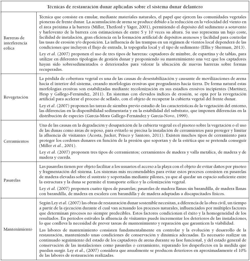Los métodos que permiten la restauración, estabilización, recuperación y rehabilitación de sistemas dunares mediante procesos naturales se centran en diferentes técnicas de actuación y protección, siendo las más empleadas las trampas de interferencia eólica, las pasarelas elevadas sobre dunas, los cerramientos perimetrales de frentes dunares, la eliminación del uso recreativo sobre dunas y/o la revegetación, dando resultados satisfactorios en las últimas décadas (Gómez-Piña et al., 2002; Lithgow et al., 2013). Se trata de actuaciones poco costosas en las que la inversión económica realizada es pequeña en relación con los resultados que se obtienen (Roig-Munar et al., 2009). Las técnicas de restauración dunar han de ser realizadas previo análisis de la evolución espacio-temporal del sistema, siendo la estrategia de restauración la identificación de los impactos, las causas y los efectos, así como los elementos naturales y/o antrópicos que favorecen su erosión (Hesp y Walker, 2012). La implantación de medidas correctoras y protectoras sirven para paliar, reducir y evitar el incremento de procesos erosivos.