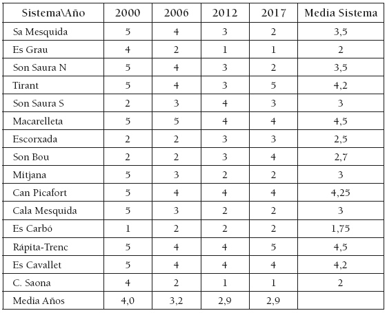 Las medidas obtenidas para cada área analizada, por años y por sistema, determinan la evolución y la tendencia asociada a medidas de gestión encaminadas a su recuperación (Tabla 2). Se parte del análisis en el año 2000, previo a las actuaciones de restauración, y posteriormente de los años 2006, 2012 y 2017. La tendencia evolutiva de cada sistema, según los criterios aplicados y descritos de restauración, tendría que dar como resultado una tendencia de valores altos (estadios más erosivos) hacia valores bajos (menos erosivos), con el objetivo final de recuperar las morfologías en su estado original.