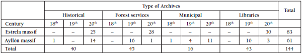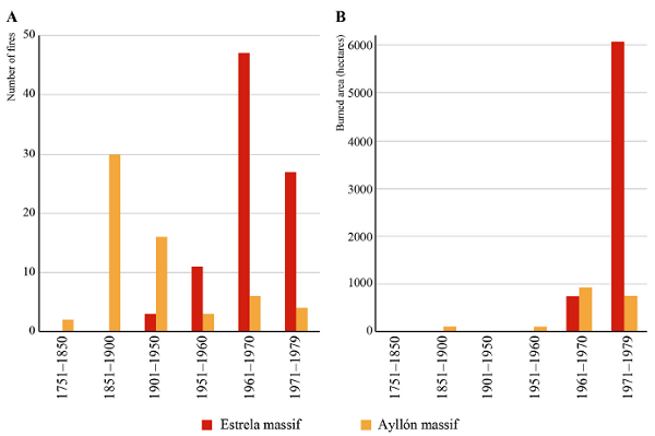 Even though fire statistics only started in the second half of the twentieth century for both Portugal and Spain, it was possible to reconstruct the fire history for both ends of the Central Mountain System from 1768 to 1979 using geohistorical sources —1925 to 1979 for the Estrela massif and 1768 to 1979 for the Ayllón massif (Table 4)—. Most of the information was obtained from administrative documents gathered in the forest services and historical archives, while municipal archives just provided records for the Ayllón massif (Figure 2). In fact, documentary sources rarely report wildfires prior to the twentieth century in Portugal (Figure 3), which does not mean that fire was not present in the territory. Instead, it is possible that some fires were not recorded because they did not represent significant socioeconomical losses at the local scale (Montiel-Molina, 2013b).