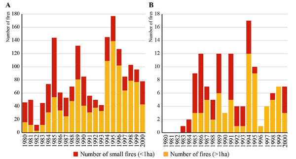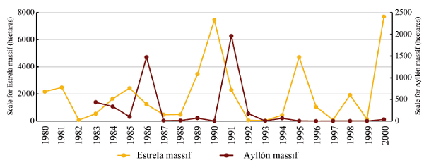 During the statistical period (1980–2000), fire records were quite different at either end of the Cen- tral Mountain System. In comparison with the 1731 wildfires recorded in the Estrela massif, only 123 wildfires were recorded in the Ayllón massif, and the average burned area was much higher in the Estrela massif than in the Ayllón massif. The annual evolution also differed in both areas. In the Estrela massif, there was an initial peak in the number of fires in 1985 and then others peaks took place (Figure 5).
