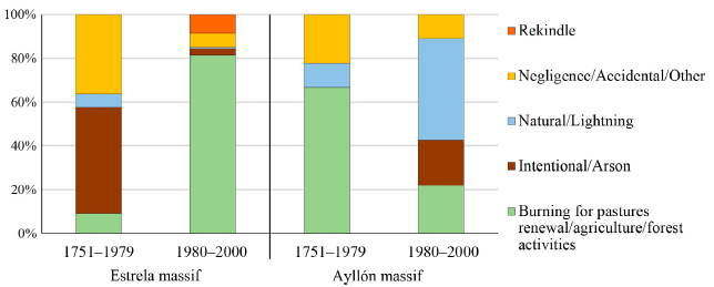 The causes of fire changed significantly between the historical and the statistical period at both ends of the Central Mountain System. In the Estrela massif, most historical wildfires were intentional or due to negligent use of fire. A small proportion of fires stemmed from natural causes or burning activities for pasture renewal, agriculture or forest activities (Figure 7).
