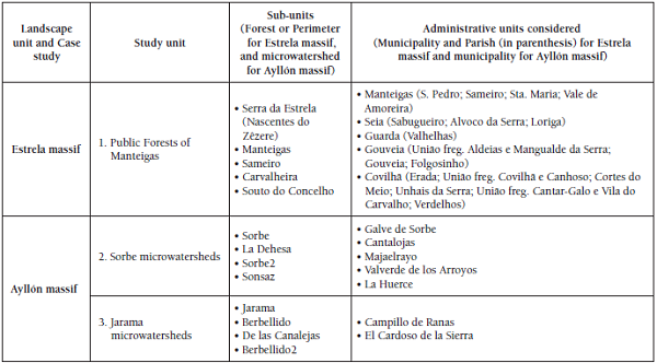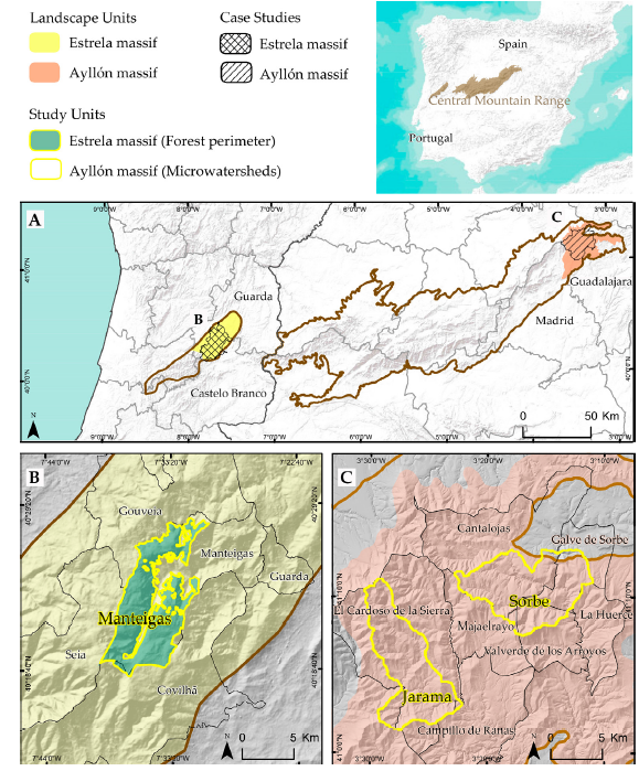 Either end of the Central Mountain System presents dissimilar territorial and social background. Thus, the case studies have been selected based on two main assumptions: territorial specificity and diversity on a local scale (socio-ecological features), and the evidence of fire footprint on the landscape (historical fire records). The national specificities and administrative constraints led to the selection of three study units using different criteria at the respective ends of the natural region (Figure 1): one in Estrela massif (delimited using public forest perimeters) and two in Ayllón massif (delimited using micro- watershed units). The public forest included in the Manteigas study unit, in the Estrela massif, includes the five public forest areas in the municipality of Manteigas in the Guarda district, where the Manteigasforest perimeter is a pioneer in terms of protection and regulation of Portuguese public forests. In theAyllón massif case study, two study units were selected (i.e., Sorbe and Jarama watersheds), which coverseven municipalities within the province of Guadalajara (Table 1). Municipalities were taken as the basicspatial unit for data collection, although in a multi-scale approach considering that the district, regionaland national scale were applied for data processing and analysis. The total area of the Estrela massif casestudy is 58,000 hectares and the total area of the Ayllón massif case study is 63,000 hectares.