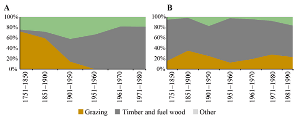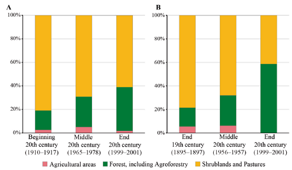 The general land use trend in the Estrela massif and in the Ayllón massif since the end of the nine- teenth century has seen forest area progressing against shrubland and pastures, although featuring some local particularities (Figure 8).