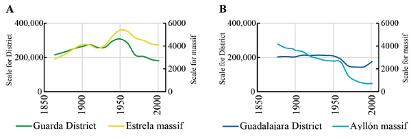 In Portugal, statistics show that the average number of inhabitants in Manteigas has always been low and the downward trend in population growth after the sixties followed the same trend as the District of Guarda. In the Ayllón massif, growth trends did not always follow the Province of Guadalajara. The population in the Province rose after 1981, due to the metropolitan dynamics of the urban region of Madrid, but in the massif, population growth moved against this trend, even though some municipalities were annexed in 1970 and 1981, which increased the number of inhabitants. In both cases, population declined most numerically in the sixties, seventies and part of the eighties due to emigration processes and rural exodus (Galvão & Devy-Vareta, 2010; Paniagua & Hoggart, 2001), which coincide with the increase in burned area.