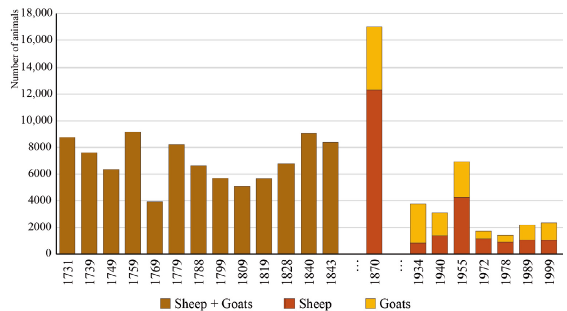 At both ends of the Central Mountain System, local societies are rural mountain communities, which lived off subsistence farming (cultivation of cereals and potatoes), raising livestock and of the transhumance of wool livestock, although the latter was much more important in Spain than in Portugal. In the Estrela massif, the grazing system of transhumance (i.e., migratory herding) for wool production lasted until the beginning of the twentieth century from the Estrela massif in summer to the Alentejo area in winter. After that, there was still transhumance but confined to the mountain area and the core production switched to traditional sheep’s cheese where the average production property was a small-scale family milk production facility (Martinho, 1981). Livestock units were abundant in Manteigas through the nineteenth century, reaching a peak at the end of the nineteenth century boasting more than 16,000 units (Figure 11).