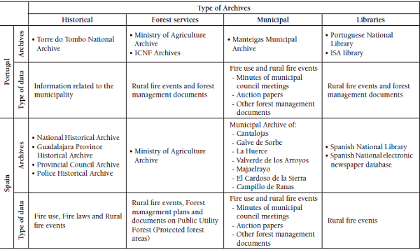 The research resources used were geohistorical sources (documentary texts and historical cartography), and geospatial and statistical data. The documentary texts include administrative papers (i.e., the minutes of municipal council meetings, auction papers and other forest related reports), documents from legal proceedings (i.e., judicial accusations, police reports, applied fines, and court files) and documents providing information to the community (i.e., the regular newspaper and the official bulletin). These geohistorical data appear in four types of archives: historical archives (national, district/province, and municipal level), forest services and municipal archives, and libraries (traditional and electronic). In fact, documentary sources provided the basis to reconstruct the Fire History Dataset (FHD) for the inland regions of the Iberian Peninsula.