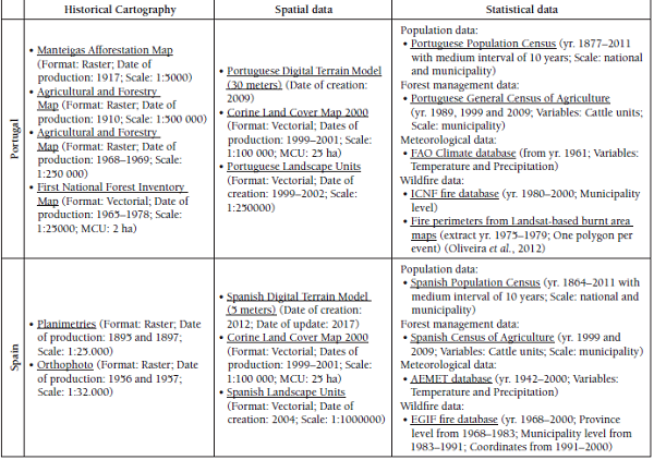The geospatial data comprise land use cartography —three maps for the Portuguese case study, and two maps for the Spanish case studies, covering representative historical temporal periods— and the digital terrain model with maximum detail available for each country (thirty meters for Portugal and five meters for Spain). Finally, statistical data related to population, forest management and wildfires were collected from national census and databases at different institutions (Table 3).